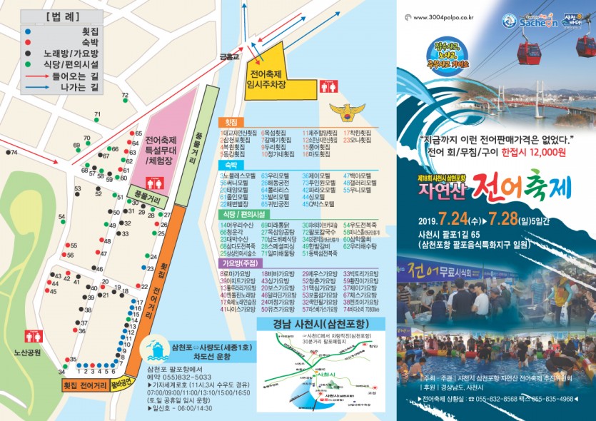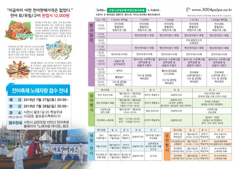 삼천포항 전어축제 추진위원회는 금어기가 해제되는 7월16일 이후 전국에서 최초로 잡히는 여름철 햇전어로 2019.7.24.(수)-7.28.(일)까지 5일간 경남 사천시 삼천포항 팔포음식특화지구 일원에서 제18회 사천시 삼천포항 자연산 전어축제를 개최합니다.