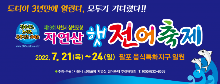 2020년 7월 24일(금) ~7월 27일(월), 4일간 개최예정된 제19회 사천시 삼천포항 자연산 전어축제는 코로나 19(COVID-19) 예방 및 확산 방지를 위하여 취소 되었음을 알려드리며, 내년에 더 좋은 프로그램으로 준비하여 찾아뵙겠습니다.