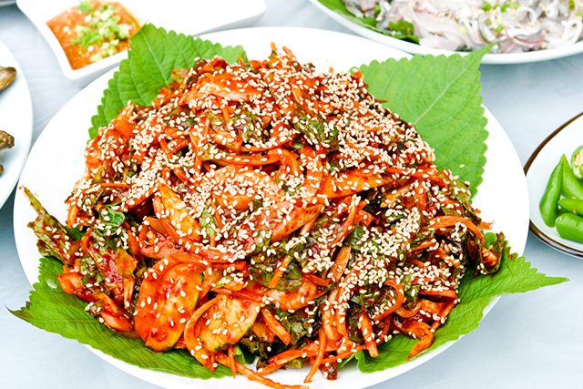 전어회가 무와 당근, 양파, 오이 등과 함께 무침의 빨간색이 보는 것만으로도 입맛을 자극합니다. 회와 같은 맛에 시큼한 장맛과 신선한 야채맛이 어우러져 새콤하면서도 시원한 맛이 입안을 감쌉니다.